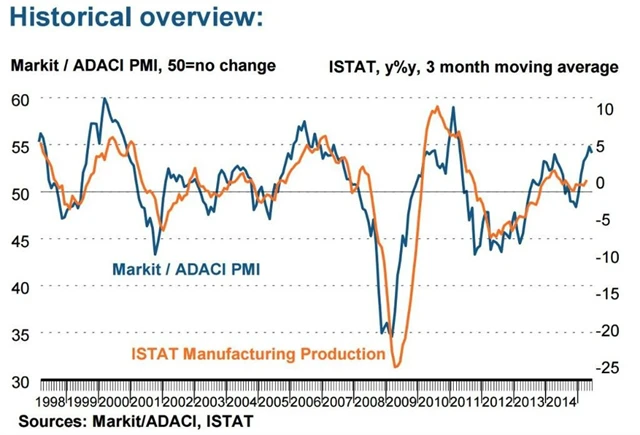 Index nákupních manažerů ve zpracovatelském sektoru Itálie v červnu klesl na 54,1 bodu z 54,8 bodu v květnu. Čekal se mírnější pokles na 54,3 bodu. Přesto se index stále nachází vysoko nad klíčovou padesátibodovou hranicí dělící kontrakci od expanze. Zaměstnanost rostla stejným tempem jako v květnu, je tedy stále na 51měsíčním maximu, produkce mírně zpomalila, stále však expanduje solidním tempem a růst cen vstupů byl nejrychlejší od února 2012.