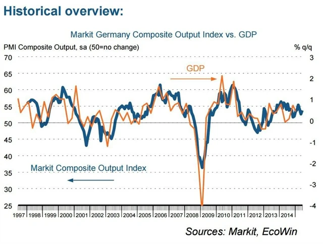 Německý sektor služeb v červnu expandoval méně, než se čekalo. Index nákupních manažerů se v tomto odvětví podle finálních dat agentury Markit vyšplhal na dvouměsíční maximum 53,8 bodu z květnových 53 bodů, předběžná data však počítala s růstem na 54,2 bodu. Zaměstnanost i nové zakázky rostly pouze mírně, avšak stále rostou. Kompozitní index se díky tomu zvýšil také na dvouměsíční maximum 53,7 bodu oproti květnovým 52,6 bodu, podle předběžných dat měl vzrůst na 54 bodů. Průměrná hodnota za celé druhé čtvrtletí (53,5 bodu) byla nicméně nižší, než během prvních tří měsíců letošního roku (54,2 bodu).