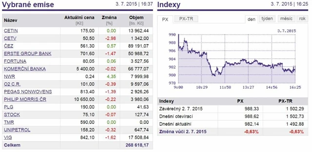 Index PX v pátek klesl o 0,63 % na 982,14 bodu a za celý týden odepsal 1,3 %. V pondělí zůstane pražská burza kvůli státnímu svátku zavřená, a znovu se tak s českými akciemi začne obchodovat až v úterý.