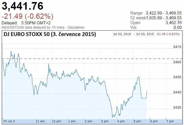 Index DJ EURO STOXX 50 během pátečního obchodování oslabil o 0,6 % a uzavřel na 3 441,76 bodu. Analytik Peter Oppenheimer z banky Goldman Sachs předpověděl, že v případě odmítnutí podmínek věřitelů v referendu by index mohl sestoupit až na 3 150 bodů.