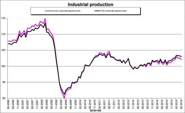 Průmyslová výroba v eurozóně v květnu nečekaně meziměsíčně klesla o 0,4 %, očekával se růst o 0,2 % po dubnové stagnaci. Meziročně se produkce zvýšila o 1,6 % při očekávání 2% růstu.