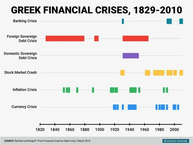 Reinhart a Rogoff ověřovali, zda země v jednotlivých letech neprodělávala tu či onu krizi. Na grafu jsou řecké krize od roku 1829, tedy od doby, kdy se země stala nezávislou na Osmanské říši.