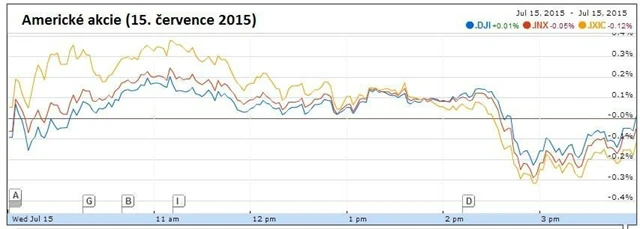 Americké akcie ve středu po čtyřech dnech růstu v závěru obchodování srazily pod nulu nepokoje v Řecku