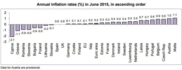 Podle finálních dat evropského statistického úřadu Eurostat tempo růstu spotřebitelských cen v eurozóně v červnu kleslo na 0,2 % meziměsíčně z předchozích 0,3 %, jak očekávala předběžná data. V červnu 2014 byla inflace v eurozóna na 0,5 %. V celé Evropské unii zpomalila inflace dokonce na 0,1 % z 0,3 % v květnu, o rok dříve byla na 0,7 %.