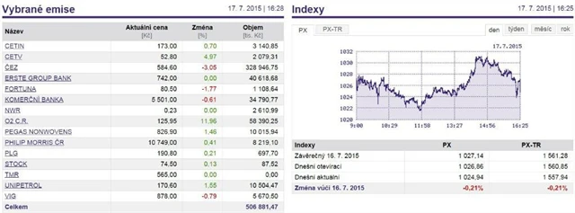 Více než polovinu objemu zastupovaly akcie skupiny ČEZ, které odevzdaly přes tři procenta, a tlačily tak burzu dolů. Nedařilo se ani Komerční bance, jejíž cenné papíry oslabily o 0,61 %, Fortuně, která ztratila 1,77 %, a pojišťovně VIG, jejíž cenné papíry zlevnily o 0,79 %. Zbytek burzy se pohyboval v zelených číslech.