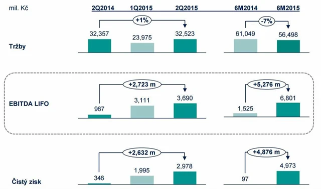 Tržby firmě nicméně vzrostly pouze o procento, když se zvýšily z 32,357 miliardy korun v loňském druhém čtvrtletí na 32,523 miliardy korun v letošním druhém kvartálu. Za první pololetí tržby byly 56,498 miliardy Kč, meziročně tedy mírně nižší (loni dosáhly za prvních šest měsíců roku 61,049 miliardy Kč).