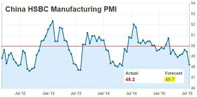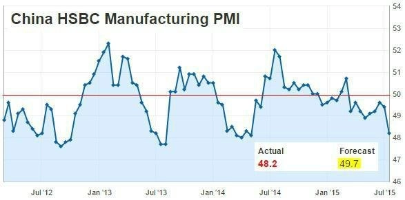Předběžný čínský výrobní index nákupních manažerů trhy zaskočil výrazným poklesem. Ukazatel klesl na 48,2 bodu, což je nejnižší hodnota za patnáct měsíců. Podle analytiků to může být způsobeno nedávnými propady na čínských akciových trzích a slabší exportní poptávkou. Agentura AP uvedla, že je pokles indexu další známkou zhoršujícího se stavu čínské ekonomiky.