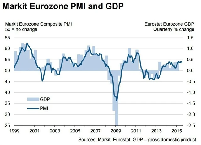 Růst aktivity ve zpracovatelském sektoru ve společenství zemí platících eurem v červenci zpomalil. Index nákupních manažerů klesl na 52,4 bodu z 52,5 bodu v červnu, předběžný index však počítal s poklesem na 52,2 bodu. Slabé euro tlačilo nahoru ceny vstupů a ukazatel se držel poblíž 14měsíčního maxima dosaženého v červnu, přestože Řecko padlo na rekordní dno.
