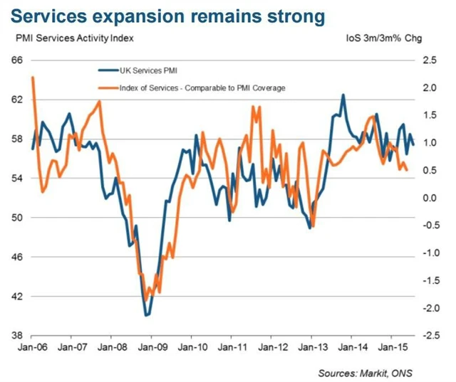Index nákupních manažerů ve Spojeném království v červenci klesl na 57,4 bodu z 58,5 bodu v červnu, očekával se mírnější pokles na 58 bodů. Zaměstnanost rostla nejpomalejším tempem od března 2014, přestože celková expanze zůstává solidní. Do odvětví stále přicházejí nové firmy, ačkoli očekávání firem do budoucna v červenci spadlo na pětiměsíční minimum. Kompozitní index se snížil na 56,6 bodu při očekávání poklesu na 56,9 bodu z červnových 57,4 bodu.