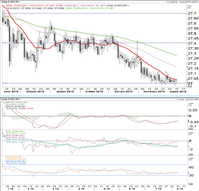 Pár konsoliduje nad psychologickou a ČNB hlídanou hladinou 27. MACD je v růstovém trendu v záporném teritoriu, obě ROC jsou v postranním trendu pod nulovou úrovní, RSI je rovněž v postranním trendu nad úrovní přeprodanosti. Momentum je jasně propoklesové, ale hladina 27 by měla držet, a konsolidace by proto měla pokračovat.