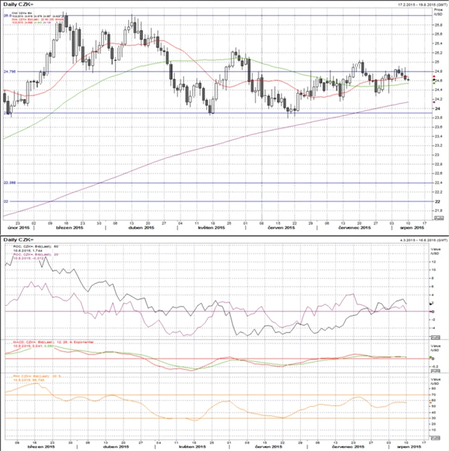 Pár konsoliduje pod hladinou 24,80. MACD je v konsolidaci těsně nad nulou. ROC20 konsoliduje na nule a ROC50 roste nad nulou. RSI obrací k poklesu nad neutrální úrovní 50. Momentum je velice mírně prorůstové. Kurz bude v týdenním horizontu patrně pokračovat v konsolidaci na 20- a 60denním klouzavém průměru pod hladinou 24,80.
