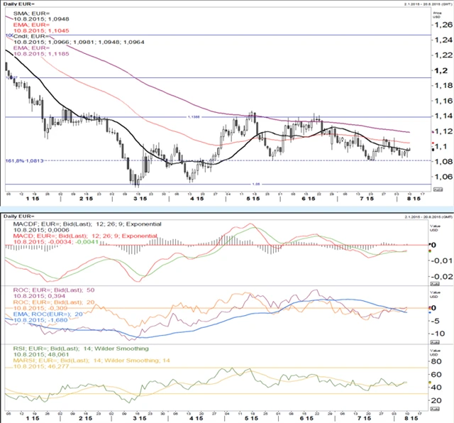 Pár se drží nad 1,08. MACD je v postranním trendu pod nulou. Obě ROC jsou v postranním trendu lehce pod nulou. RSI jde do strany poblíž neutrální úrovně. Momentum je velice mírně propoklesové. Pravděpodobné je pokračování konsolidace mezi klouzavými průměry a hladinou 1,08.