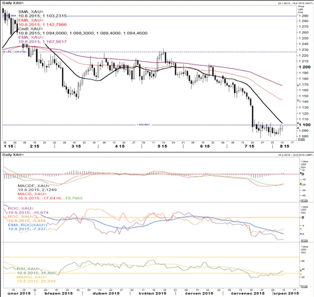 Zlato bylo do pondělí v konsolidaci pod psychologickou úrovní 1 100. MACD se pomalu otáčí k růstu a je pod nulou. ROC20 je v mírném růstovém trendu pod nulou. ROC50 klesá pod nulou. Obě jsou přeprodané. RSI vyslal nákupní signál. Momentum je silně propoklesové. Kombinace signálu od RSI a silné přeprodanosti vytváří prostor pro korekci nad 1 100, kterou naznačilo již pondělní obchodování.