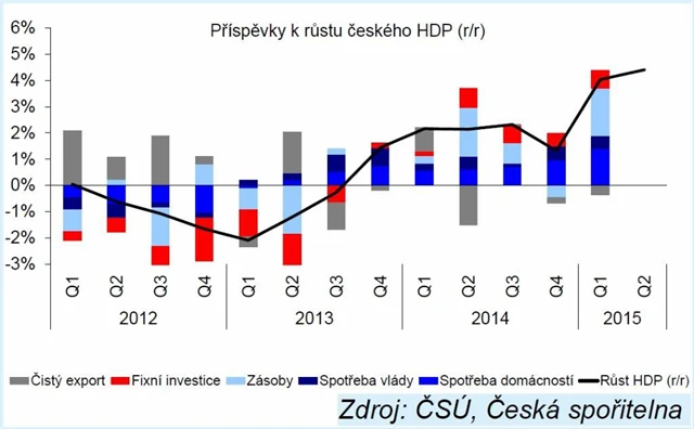 "Růst české ekonomiky stejně jako v prvním čtvrtletí letošního roku i ve druhém kvartálu překonal i ty nejoptimističtější odhady. Pro srovnání, ekonomika našeho největšího obchodního partnera, Německa, vzrostla ve druhém čtvrtletí jen o 1,6 % meziročně. Protože je ale růst tažen snahou dočerpat peníze z EU, tak je jasné, že se stejné číslo v příštím roce nebude opakovat a dojde ke zpomalení. Podle našeho odhadu na 2-2,5 %," dodal David Navrátil, hlavní ekonom České spořitelny.