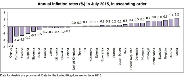 Negativní meziroční míry inflace v červenci byly pozorovány v jedenácti členských státech Unie. Nejnižší míru zaznamenaly Kypr (-2,4 %), Rumunsko (-1,4 %) a Řecko (-1,3 %). Největší meziroční přírůstek vykázaly naopak Malta (+1,2 %), Rakousko (+1,1 %) a Belgie (+0,9 %).