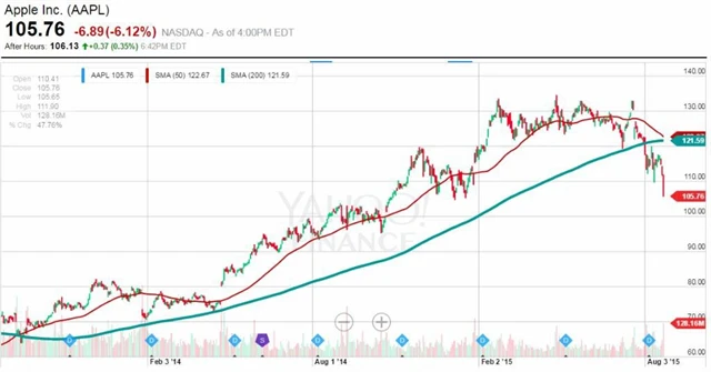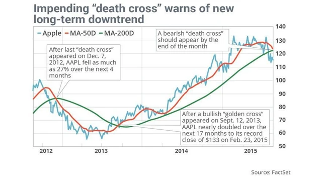 Když se kříž smrti objevil naposledy (právě ve chvíli, kdy akcie korigovaly z rekordních maxim), klesla cena Applu v následujících čtyřech měsících o 27 %.