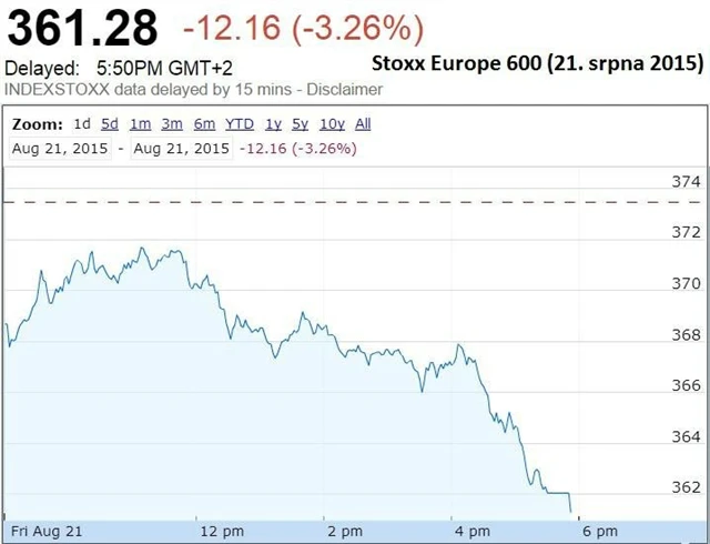 Výprodejová vlna, která smazala americké zisky za letošní rok a stáhla dolů čínské akcie, zasáhla v pátek i evropské trhy. STOXX Europe 600 za poslední tři dny ztratil 6,7 %, což znamená nejprudší pokles od září 2011. Páteční ztrátou se tak připojil k britskému FTSE 100 a německému indexu DAX, které už korekci zahájily.