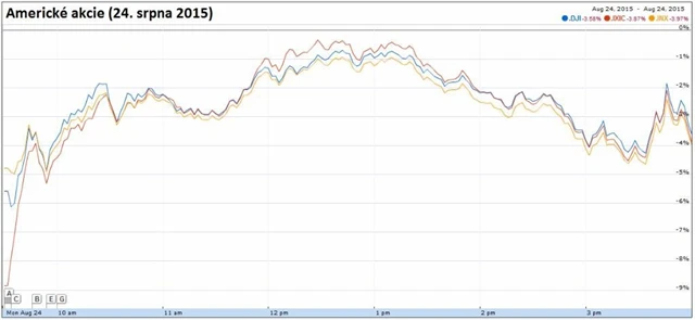 Americké akcie do nového týdne vstoupily prudkým poklesem, Nasdaq odepisoval přes sedm a půl procenta, Dow se poprvé od února 2014 propadl hluboko pod 16 000 bodů a S&P 500 se zřítil pod 1 900 bodů. Během dopoledne hlavní indexy ztráty pomalu umazávaly a kolem 18.30 SELČ byly de facto na nule. Poté se ale opět vytvořil přetlak na straně prodejců a akcie se sesunuly zpět do výrazného mínusu.