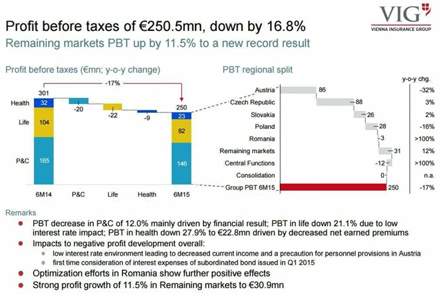 Z pohledu vývoje čistého zisku se skupině dařilo především v Rumunsku, kde meziroční nárůst dosáhl více než 100 %. Podle managementu VIG výsledek podpořila optimalizace fungování společnosti. V ČR se pololetní čistý zisk meziročně zvýšil o tři procenta a na Slovensku vzrostl o dvě procenta. V Rakousku naopak skupině čistý zisk klesl o 32 % a v Polsku se snížil o 16 %. Na ostatních trzích (Srbsko, Turecko, Albánie) VIG čistý zisk dohromady vzrostl v pololetí o 12 %.