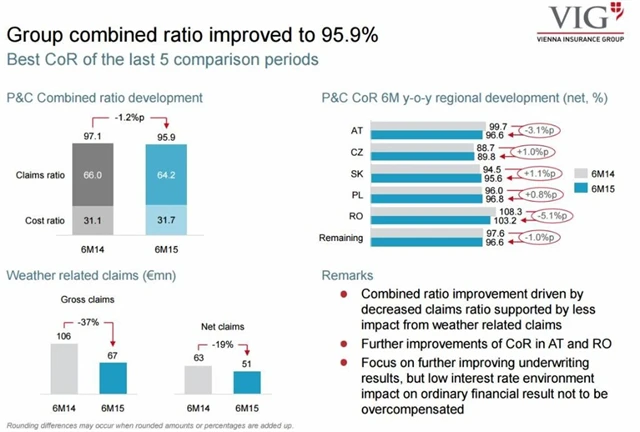 Kombinovaný poměr meziročně klesl o 1,2 procentního bodu na 95,9 %. Skupina ve výsledkové zprávě uvedla, že k poklesu kombinovaného poměru došlo vlivem nižšího počtu hlášených pojistných událostí díky příznivým klimatickým podmínkám.