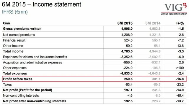 Rakouská pojišťovnická skupina Vienna Insurance Group (VIG) v letošním prvním pololetí hospodařila se ziskem před zdaněním 250,5 milionu eur. V samotném druhém čtvrtletí dosáhl zisk před zdaněním 119,5 milionu eur a čistý zisk byl 93,7 milionu eur. Zisk před zdaněním za prvních šest měsíců roku se meziročně snížil o 16,8 %.