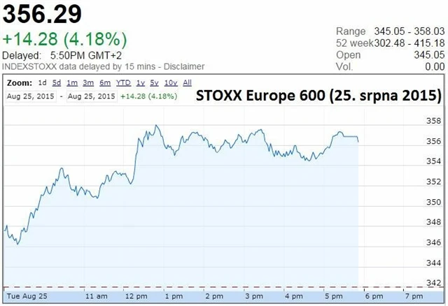 Panevropský FTSEurofirst 300 v úterý připsal 4,2, a zaznamenal tak nejprudší jednodenní nárůst od roku 2011. V pondělí ztratil 5,4 %, což naopak představovalo jeho nejprudší pokles za téměř sedm let. K růstu evropských akcií přispěla překvapivě příznivá zpráva o vývoji podnikatelské nálady v Německu. Mnichovský výzkumný institut Ifo dopoledne oznámil, že index podnikatelské nálady v srpnu stoupl na 108,3 bodu z červencových 108 bodů. Analytici přitom očekávali pokles ukazatele na 107,7 bodu.