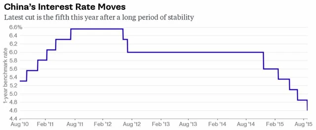- Čínská centrální banka v úterý již po páté v posledních devíti měsících snížila svou základní úrokovou sazbu, tentokrát o 0,25 procentního bodu na 4,6 %. Požadavek na minimální rezervy komerčních bank snížila o 0,5 procentního bodu na 18 %. Kvůli obavám z rychlého zpomalení tempa růstu čínské ekonomiky nyní prudce oslabují akcie v Číně i jinde ve světě a banka se tímto krokem snaží uklidnit a stabilizovat domácí akciový trh.
