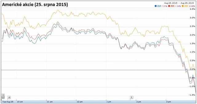 Americké akcie po zahájení úterního obchodování výrazně zpevňovaly, a umazávaly tak podstatnou část pondělních ztrát. Investory podpořilo rozhodnutí čínské centrální banky snížit úrokové sazby a minimální rezervní poměr pro banky s cílem podpořit čínské akcie, které v úterý dál výrazně klesly. Ještě před polovinou seance se ale optimismus začal vyčerpávat a hlavní indexy rychle přešly do sestupného trendu, což vyústilo až v jejich propad pod nulu.