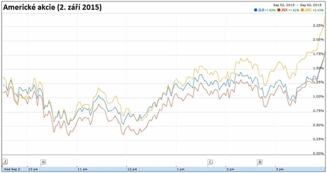 Dow připsal 1,82 % na 16 351,38 bodu, S&P 500 zpevnil o 1,83 % na 1 948,86 bodu a Nasdaq Composite vzrostl o 2,46 % na 4 749,98 bodu. Index volatility VIX spadl o 16,91 % na 26,09 bodu a výnos 10letých vládních dluhopisů USA se zvýšil o necelé čtyři bazické body na 2,19 %.