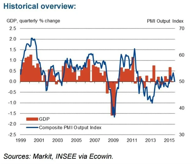 Finální data agentury Markit z francouzského sektoru služeb přinesla nečekaně negativní překvapení. Předběžný index nákupních manažerů v sektoru služeb počítal s poklesem tempa růstu, když klesl na 51,8 bodu z 52 bodů v červenci. Finální údaj byl však revidován na 50,6 bodu, čímž se ukazatel přiblížil hranici padesáti bodů, která značí stagnaci a dělí kontrakci od expanze. Kompozitní PMI klesl na 50,2 bodu z 51,5 bodu, předběžná data počítala s mnohem mírnějším poklesem na 51,3 bodu.