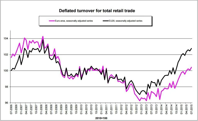 Maloobchodní tržby v eurozóně v červenci vzrostly meziročně více, než se čekalo, meziměsíčně naopak za odhady mírně zaostaly. Ve srovnání s červnem se zvýšily o 0,4 % při očekávání 0,5% růstu po 0,6% poklesu v červnu, meziročně však vzrostly o 2,7 %, čekal se růst o 2 % po červnovém zvýšení o 1,2 %. V celé Evropské unii se tržby maloobchodních prodejců zvýšily meziměsíčně o 0,3 %, meziročně pak o 3,3 %.