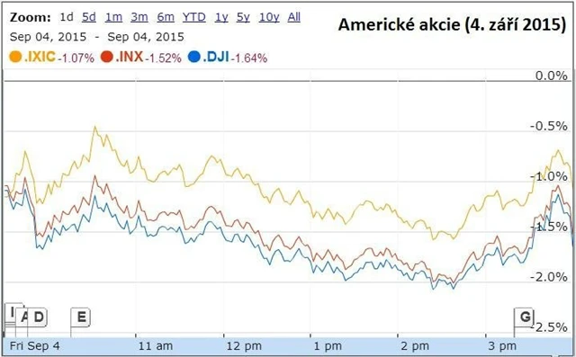 Americké akcie zahájily páteční obchodování poklesem a hlavní indexy ztrácely více než procento. Páteční nejednoznačné údaje z trhu práce nezmírnily nejistotu investorů ohledně načasování prvního zvýšení úrokových sazeb z nynějších minim. Na Wall Street navíc před třídenním volnem převládla opatrnost a obchodníci ruší dosavadní pozice.
