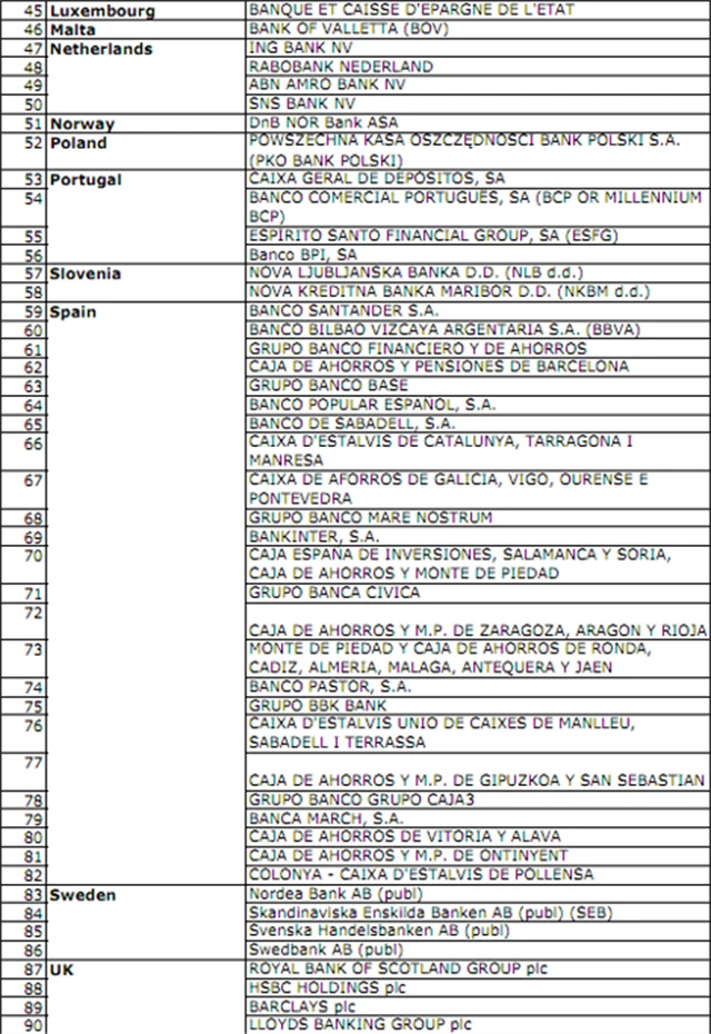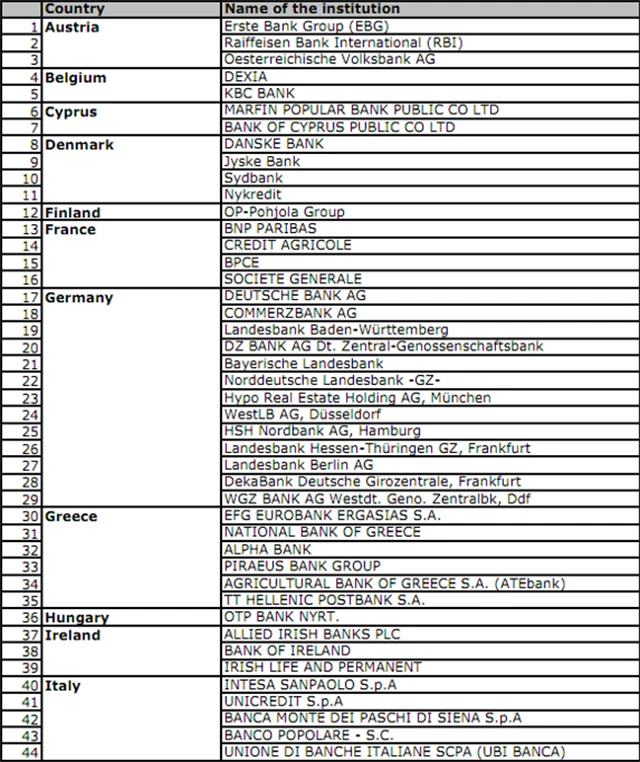 Nově testovány budou Irská Irish Life and Permanent PLC, norská DnB NOR Bank, dánská Nykredit Bank, slovinská Nova Kreditna Banka a rakouská Volksbank