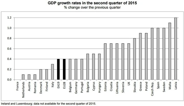 Ve všech státech, které mají data již dostupná, se HDP zvýšil. Výjimkou je Francie, kde ekonomika stagnovala. Nejvyšší mezikvartální růst zaznamenaly Lotyšsko (+1,2 %), Malta (+1,1 %), Česká republika, Španělsko a Švédsko (všechny tři shodně +1,0 %), následované Řeckem a Polskem (shodně +0,9 %), Slovenskem (+0,8 %), Estonskem, Chorvatskem, Litvou, Slovinskem a Spojeným královstvím (všechny shodně +0,7 %). Nejnižší tempo růstu vykázaly Nizozemsko, Rakousko a Rumunsko (shodně +0,1 %).