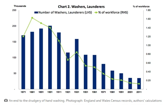 Data také připomněla téměř zapomenutý sektor. V roce 1901 bylo v Anglii a Walesu celkem 200 tisíc lidí z celkem 32,5 milionu obyvatel zaměstnáno praním oděvů. V roce 2011 z celkového počtu 56,1 milionu lidí v tomto sektoru pracovalo už jen 35 tisíc osob. "Kombinace technologií, domácích vodovodů, elektřiny a automatických praček za dostupné ceny vedla k poklesu ochoty spotřebitelů platit za ruční praní nebo služby velkých prádelen," píše se v reportu.