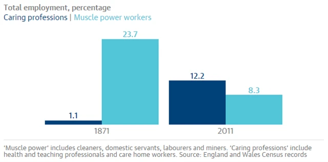 Zpráva odkazuje na tektonickou změnu pohledu společnosti na lidskou práci. Ze své historické role - tvrdé síly - se změnila spíše na péči či provizi za služby pro společnost. Za poslední dvě desetiletí došlo podle UK Labour Force Survey k 909% nárůstu počtu pomocného zdravotnického personálu a různých asistentů. Na druhou stranu ale bylo možné pozorovat pokles o 79 % u švadlen a tkalců, o 57 % u písařů a o 50 % u sekretářek.