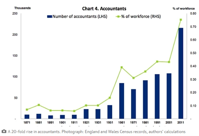 "Snadný přístup k informacím a rychlejší komunikace vedly k revoluci v odvětvích náročných na znalosti," tvrdí autoři studie. Současně narostla poptávka po profesionálních službách. Například data ze sčítání lidu od roku 1871 ukázala, že bylo v Anglii a Walesu na počátku 9 832 účetních a za 140 let se jejich počet zvedl dvacetinásobně na 215 678.