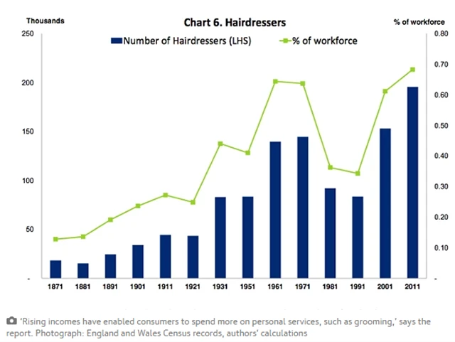 Ekonomové z Deloitte věří, že růst příjmů umožnil spotřebitelům utrácet více za osobní služby, třeba péči o tělo. To vedlo například k raketovému nárůstu v odvětví kadeřnictví. Zatímco v roce 1871 byl v Anglii a Walesu jen jeden kadeřník na 1 793 obyvatel, dnes je jeden na 287 lidí.