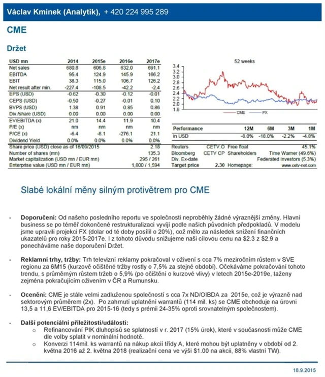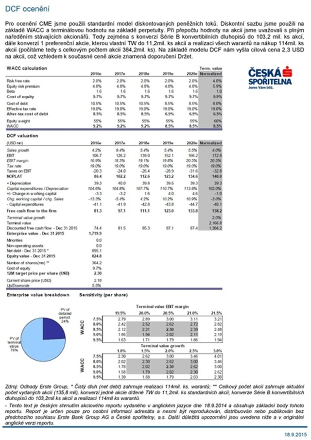 "Hlavní byznys CME se po téměř dokončené restrukturalizaci vyvíjí podle našich původních předpokladů. V modelu jsme upravili projekci FX (dolar od té doby posílil o 20 %), což mělo za následek snížení finančních očekávaných ukazatelů pro roky 2015-2017. I z tohoto důvodu snižujeme cílovou cenu akcií na 2,3 USD z předchozích 2,9 USD a ponecháváme doporučení 'držet'," napsal analytik České spořitelny Václav Kmínek.