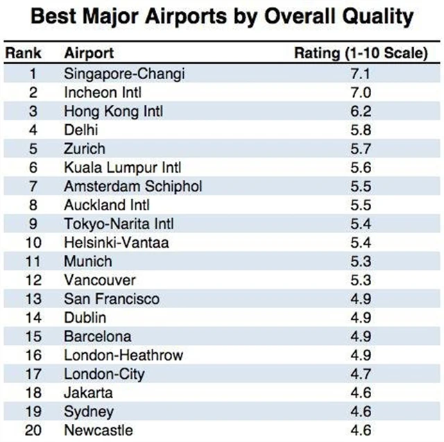 Podle Skytraxu je nejlepším letištěm na světě Changi Airport v Singapuru. Přes tento dopravní uzel, druhý největší v Asii a sedmý na světě, prošlo v roce 2014 více než 51 milionů cestujících, přičemž celková kapacita letiště dosahuje 66 milionů pasažérů ročně. Druhým nejlepším letištěm světa je podle serveru jihokorejské Incheon International Airport a bronz bere Hong Kong International Airport. "Ohromující, pětihvězdičkový zážitek. Bezpečnostní pracovníci byli neuvěřitelně vstřícní. Všechno bylo prvotřídní," stojí v jedné z pochvalných recenzí na singapurské Changi Airport.