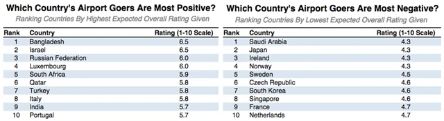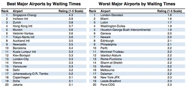 Jednoznačně nejhorší je na letišti proces odbavování. Vyzvednutí letenky, odevzdání zavazadel, pasová kontrola, bezpečnostní prohlídka, zapínání a vypínání notebooků či fotoaparátů, to vše musíme absolvovat bez ohledu na to, jak dlouhou cestu před sebou máme. Někdy dokonce na letišti strávíme více času než v letadle. Stejně jako v přehledovém hodnocení podle cestovatelů z pohledu trvání letištních kontrol a dalších procesů berou první a druhou příčku singapurské letiště Changi Airport a jihokorejské Incheon International Airport. Příliš se nezdržíte ani na mezinárodním letišti v Curychu. Naopak nejméně vstřícné je z pohledu trvání odbavení londýnské letiště Stansted následované Miami a Lutonem. Průměrné hodnocení činí 2,7 z 5 bodů.