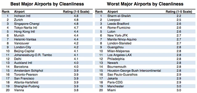 Kromě rychlosti odbavení si cestovatelé hodně všímají také toho, jak jsou na tom letiště s čistotou sociálních zařízení. Není nic horšího, než když po několikahodinovém letu vystoupíte z letadla a přijdete na toalety, kde někdo naposledy uklízel v lepším případě včera večer. Průměrné hodnocení čistoty letišť dosahuje 3,4 z 5 bodů, což není nijak oslnivý výsledek. Nejlépe dopadly opět jihokorejské letiště Incheon, mezinárodní letiště v Curychu a singapurské letiště Changi, na opačném konci žebříčku jsou letiště v egyptském Šarm aš-Šajchu a britském Liverpoolu.