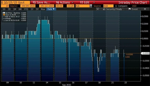 Do záporu se dostaly po minulé aukci 15. září, den před oznámením Fedu o ponechání sazeb na rekordně nízké úrovni.
