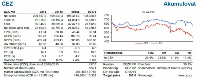 ČEZ nedávno upravil svůj výhled EBITDA pro rok 2015 ze 70 miliard korun na 68 miliard korun kvůli neplánovaným odstávkám jaderných elektráren, zpožděnému zprovoznění hnědouhelné elektrárny v Ledvicích a pomalejšímu řešení problémů ohledně udělení zelených certifikátů v Rumunsku. "Nicméně upravený výhled čistého zisku, který tvoří základ pro dividendy, zůstal na úrovni 27 miliard Kč, což značí stabilní dividendu 40 Kč na akcii při 80% dividendovém výplatním poměru," uvedl analytik. "V roce 2016 očekáváme další odstávky v elektrárně Dukovany, která se připravuje na obnovení licence."