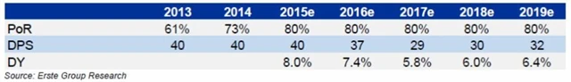 Odhad dividendy z letošního zisku (výplata v roce 2016) Bártek nezměnil, odhad pro rok 2016 ale zvýšil o 16 % díky očekávaným jednorázovým položkám. Pro rok 2017 čeká snížení dividendy o 9 % v důsledku nižších cen elektřiny (při stabilním 80% výplatním poměru). "Hrubý dividendový výnos očekáváme na úrovni 7-8 % ze zisků pro období 2015/2016, pro období 2017-2019 očekáváme jeho pokles na úroveň kolem 6 %," doplnil.