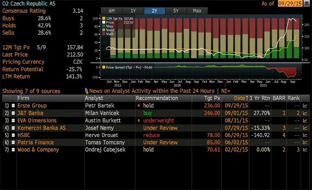 "Nadále předpokládáme, že O2 vyplatí jako dividendu přibližně 100 % čistého zisku. Zvyšujeme tak odhad dividendy na akcii o 27-36 % pro období 2015-2017," dodal Bártek.