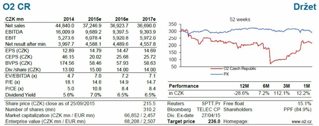 O2 reportovala o 6,5 % vyšší než očekávanou historickou proforma úroveň zisku EBITDA, solidní EBITDA za letošní první pololetí a nízkou úroveň odpisů. "Zvyšujeme tak odhad EBITDA o 12 % a odhad čistého zisku o 33 % pro rok 2015. Rovněž zvyšujeme odhady pro střednědobý výhled díky zlepšujícím se tržbám, což je částečně kompenzováno ukončením roamingu."