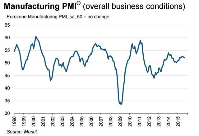 "Navzdory rozsáhlým stimulům ze strany centrální banky a značnému oslabení měny se zpracovatelskému sektoru nedaří dosáhnout výraznějšího tempa růstu a dokonce hrozí, že se růst opět zastaví," uvedl hlavní ekonom společnosti Markit Chris Williamson. Dodal, že ceny, které si výrobní podniky účtují, v září klesly nejprudším tempem za sedm měsíců. To podle něj posílí obavy z deflace a zvýší tlak na rozšíření stimulačních opatření Evropské centrální banky (ECB).