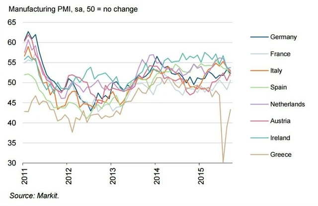 Francie se v září navrátila k růstu, v pásmu kontrakce pod 50 body se tak nachází jen Řecko. Irsko v září zaznamenalo dvouměsíční maximum 53,8 bodu, Rakousko 19měsíční maximum 52,5 bodu, Francie tříměsíční maximum 50,6 bodu, zatímco Nizozemsko spadlo na půlroční minimum 53 bodů, Španělsko na 21měsíční minimum 51,7 bodu, Itálie na sedmiměsíční minimum 52,7 bodu a Německo na dvouměsíční minimum 52,3 bodu. Index nákupních manažerů v Řecku sice vzrostl na tříměsíční maximum 43,3 bodu, stále je však hluboko pod hranicí dělící kontrakci od expanze.