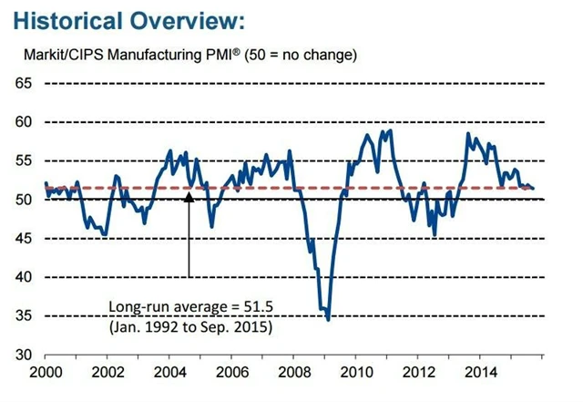 Index nákupních manažerů ve zpracovatelském sektoru Spojeného království v září klesl na 51,5 bodu z 51,6 bodu v srpnu (revidováno z 51,5 bodu), očekával se pokles na 51,3 bodu. Zaměstnanost mírně klesla a ceny vstupů klesly nejprudším tempem za více než 16 let.